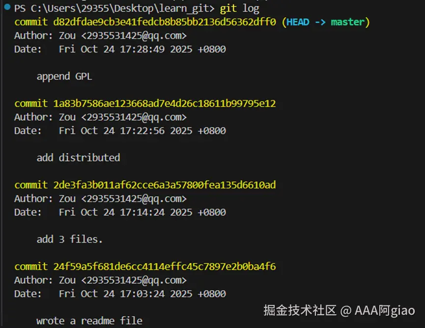 其中 HEAD -> master 表示当前所在分支和最新提交。