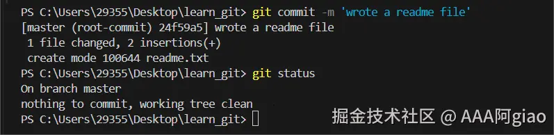 运行git commit -m 'wrote a readme file' 后再次运行git status