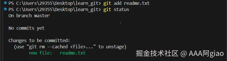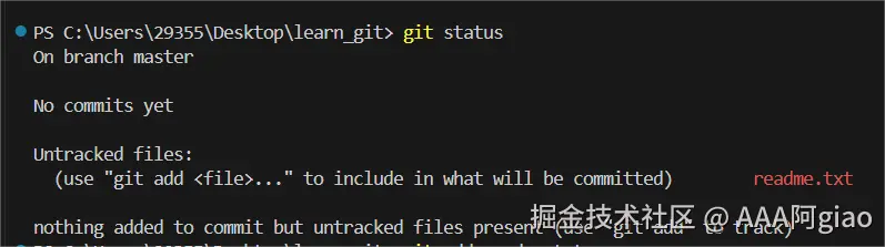 显示 readme.txt 是“Untracked files”未跟踪的文件,表示它尚未被纳入版本控制。
