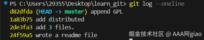 ✅git log --oneline:简化输出,每条提交只显示一行(哈希值 + 提交信息)。