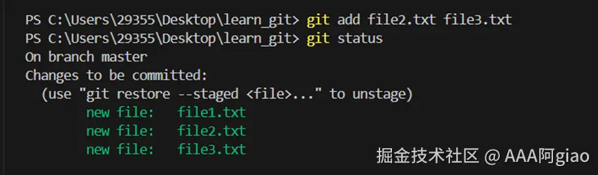 使用命令 git add file1.txt file2.txt file2.txt 后再次运行 git status
