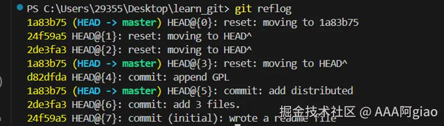 git reflog:记录你对HEAD的所有操作(包括回退、切换等)。