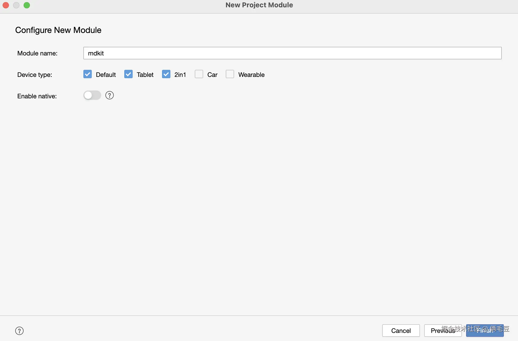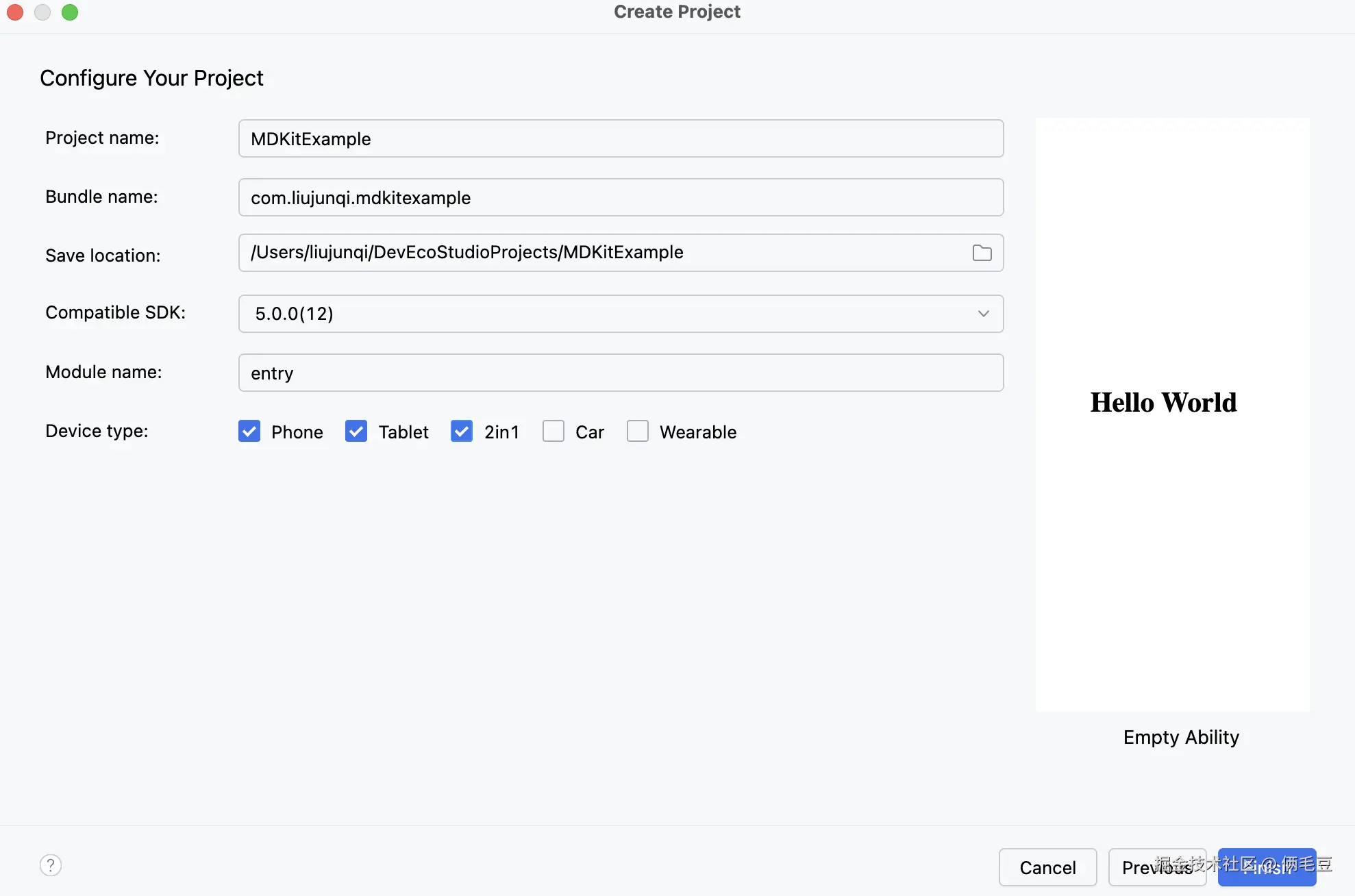 在实际的开发中可以不选择创建新项目,可以用已有的项目中创建新 Module,本文中示例创建一个新示例项目,如下图所示,创建一个名称为MDKitExample的工程。