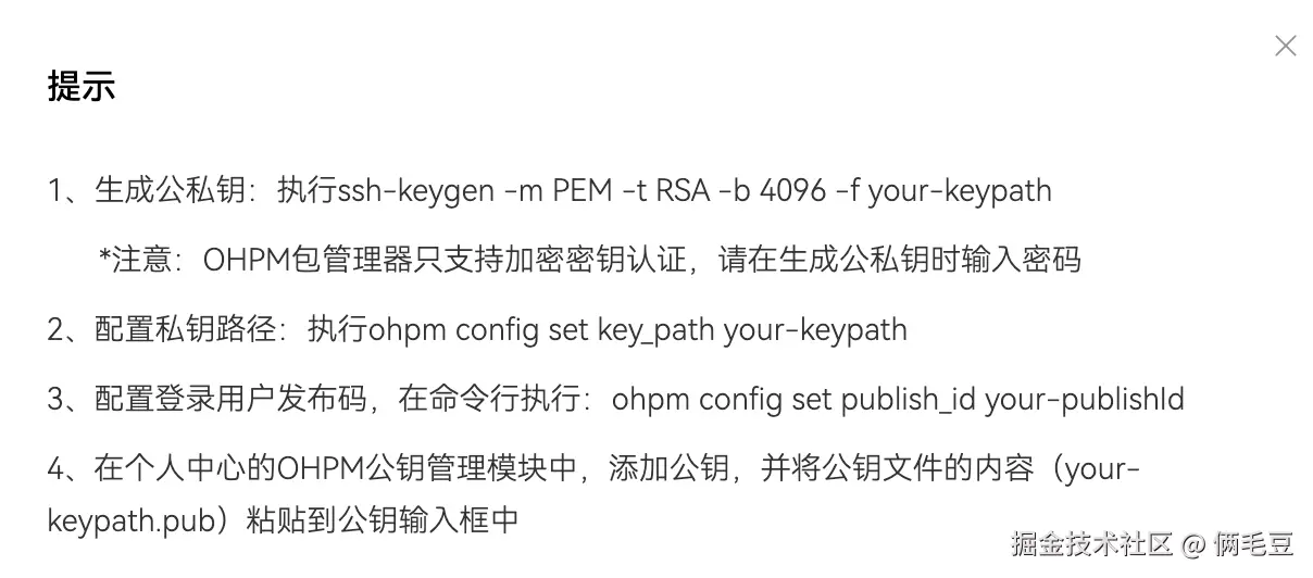 *注意:OHPM包管理器只支持加密密钥认证,请在生成公私钥时输入密码
