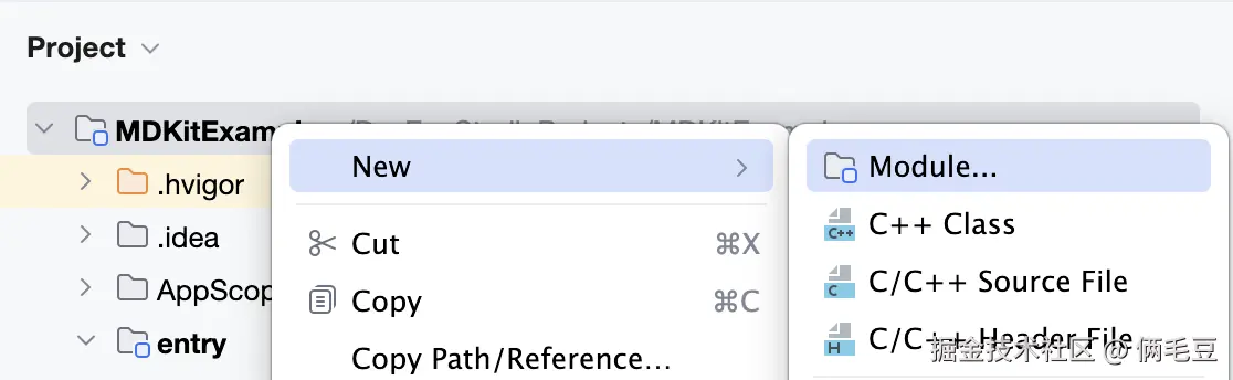 项目创建成功后,在项目根目录右键,New Module,如图所示,选择Static Library,之后Module名为mdkit(注意都是小写)