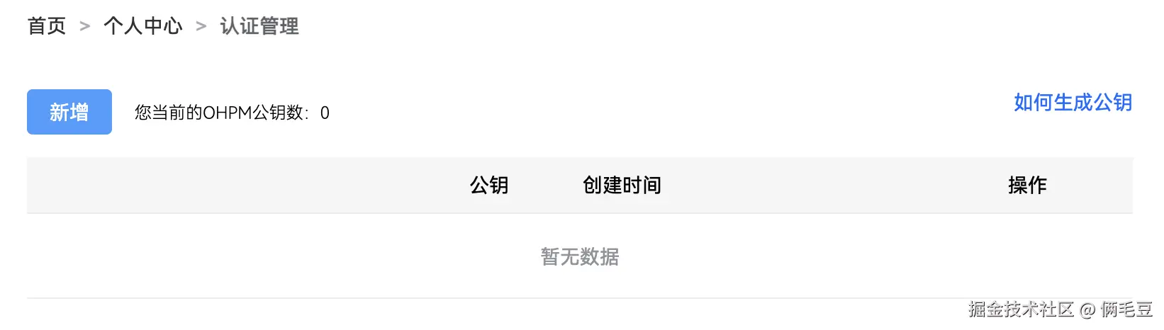 4、在个人中心的OHPM公钥管理模块中,添加公钥,并将公钥文件的内容(your-keypath.pub)粘贴到公钥输入框中(如下图中点击新增,之后会有弹框)