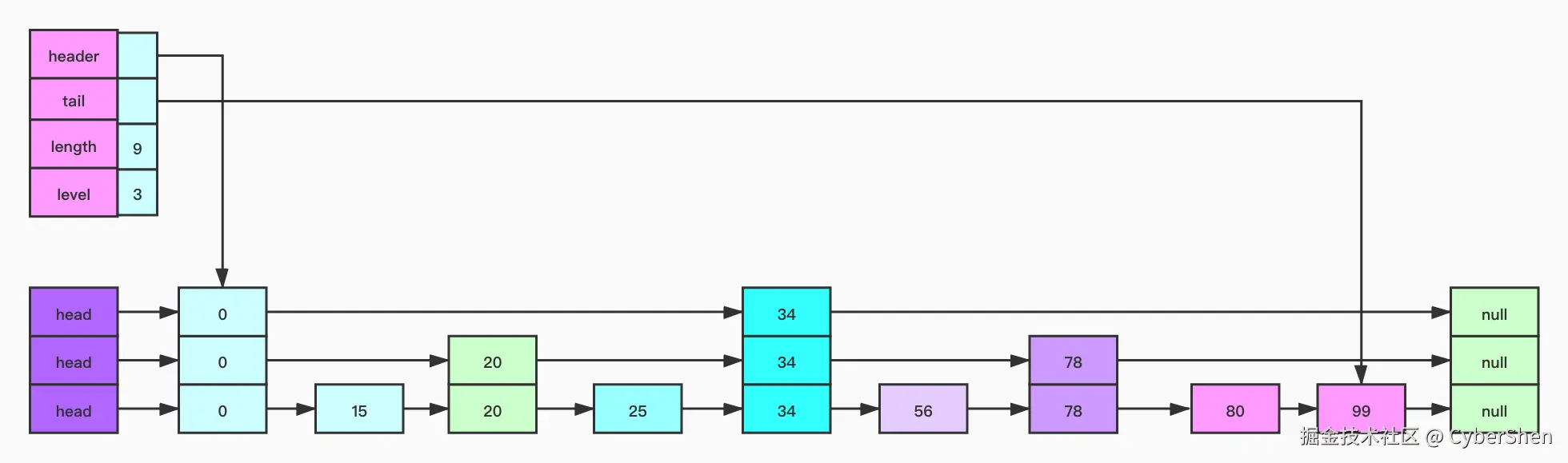 - 每一层都是一个有序链表,至少包含两个节点,头节点和尾节点。