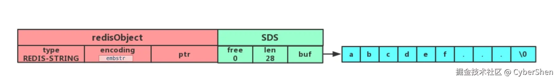 embstr编码将创建字符串对象所需的内存分配次数从raw编码的两次降低为一次;- 释放