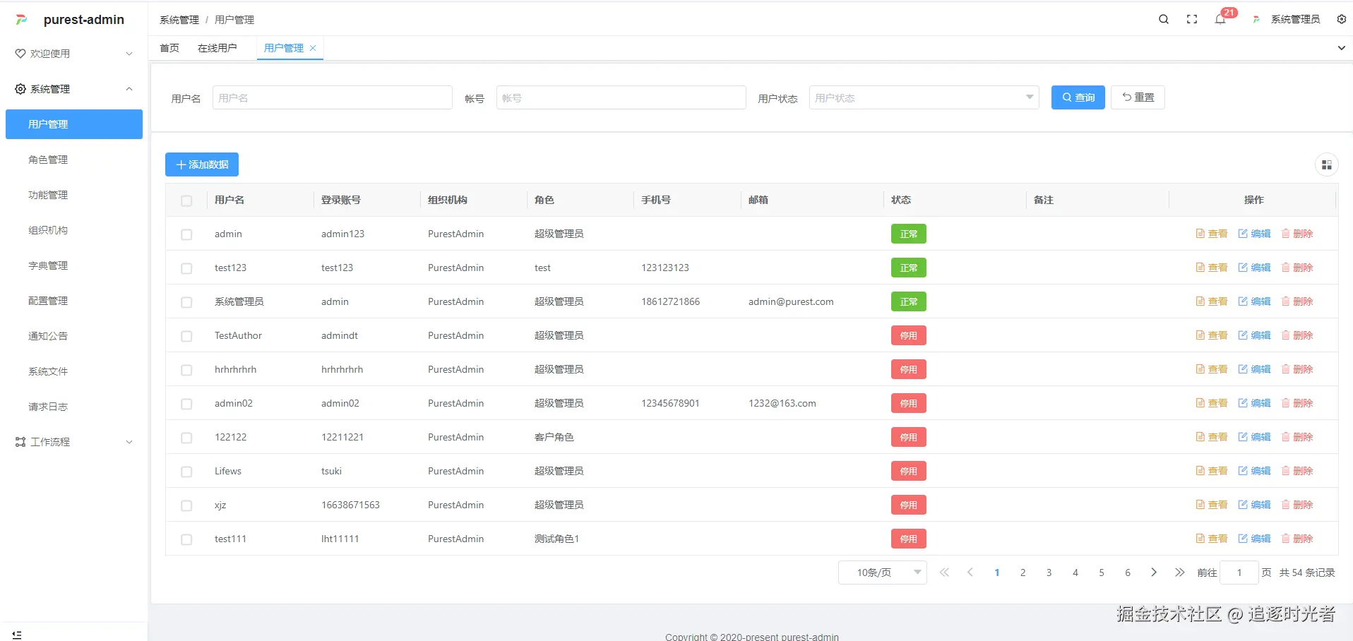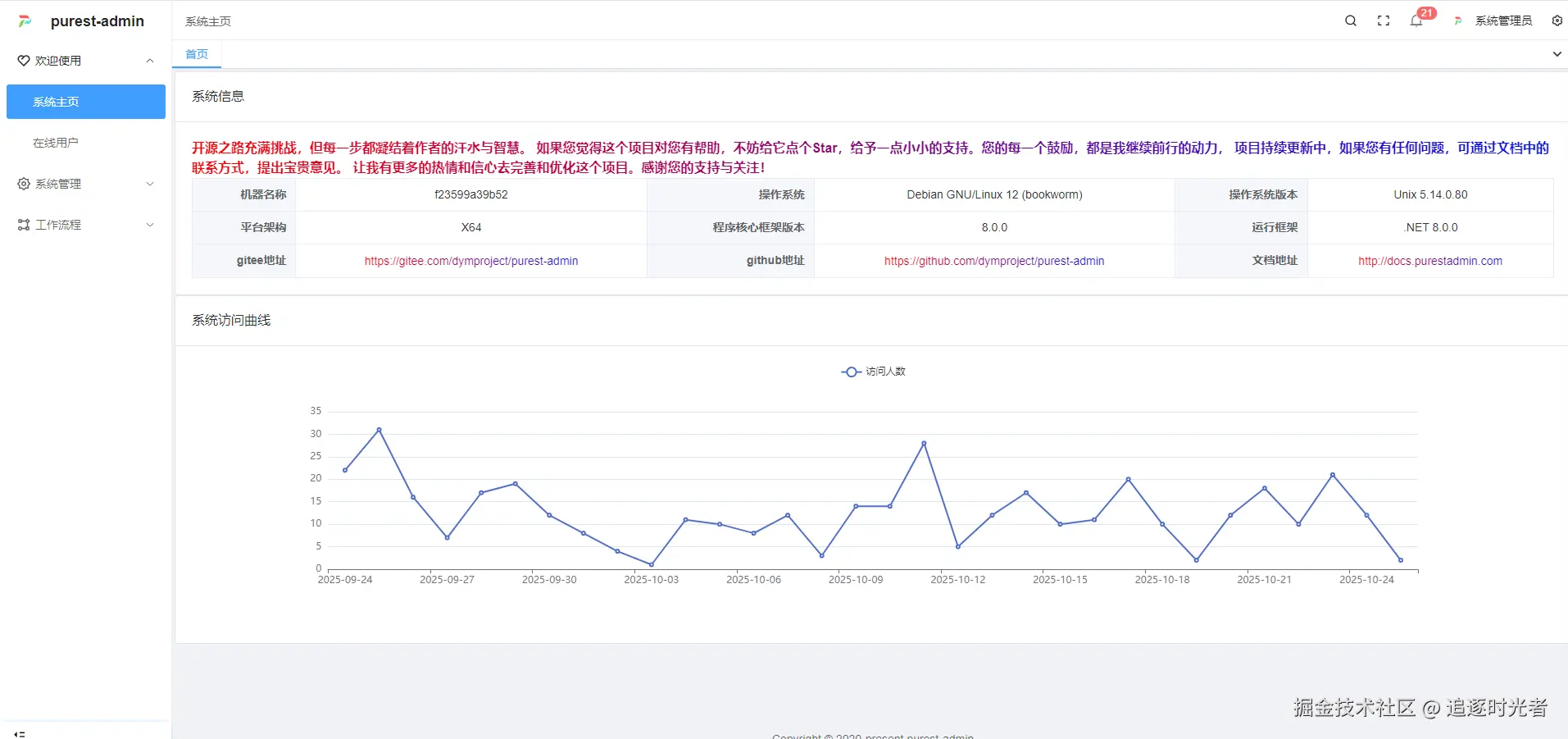Purest Admin 是一个基于 .NET 8 + Vue3 实现的前后端分离、极简 RABC 权限管理系统,基于 LGPL-3.0 协议开源,后端在 ABP 框架的设计上进行了精简和改良,前端基于 vue-pure-admin,前端极强的表格框架 vxe-table,旨在为 .NET 开发者提供一套简洁、高效、可扩展的快速开发解决方案。