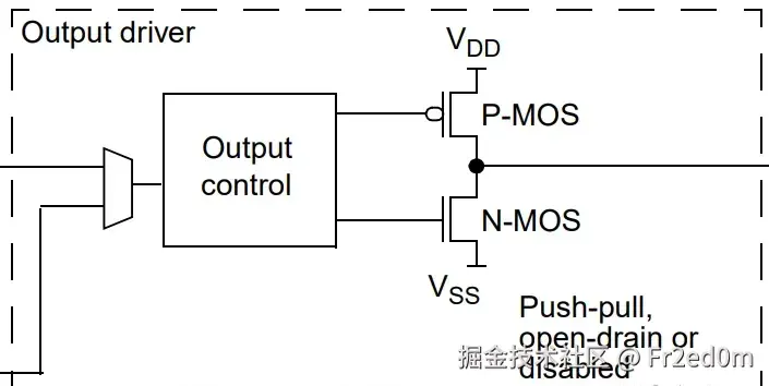 | 高电平 (1) | 接收到 置位信号 (如 BSRR 低 16 位写 1) | 导通 (开关闭合) | 截止 (开关断开) | V_DD → P-MOS → 输出引脚 。电流从芯片 流出 , 主动驱动 输出为高电平。 |