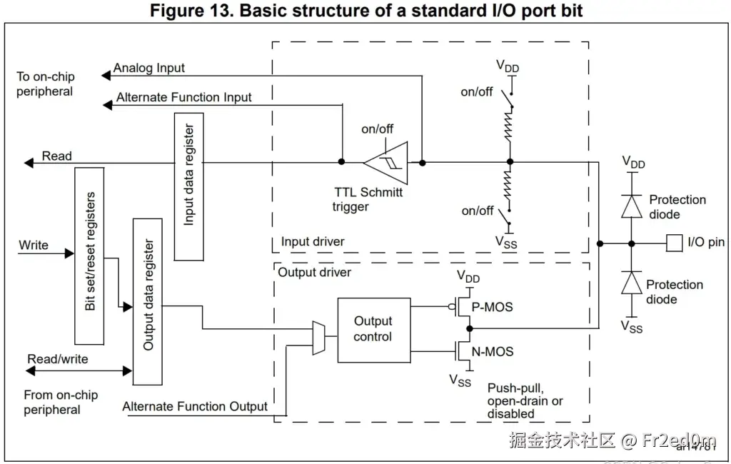 其中如下电路为保护电路,当大于 VDD-3.3~5v,保护二极管导通,电压被电源吸收,而当电压小于 vss-0v 时,由 GND 吸收,以此来达到保护芯片目的