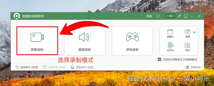 步骤1:双击启动数据 蛙录屏软件,进入主界面后可看到屏幕录制、游戏录制、音频录制等多种功能模式,用户需根据实际需求选择对应模式,本文以应用范围较广的 “屏幕录制” 为例展开说明。