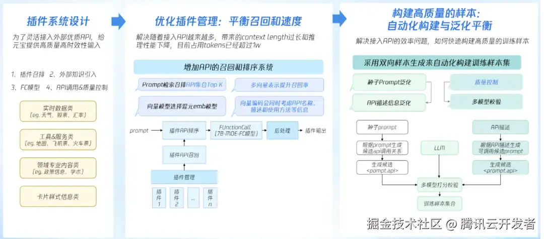 为灵活接入外部优质 API,给元宝提供高质量高时效性输入,我们开发了插件系统。相当于在传统搜索中接入合作 CP 的结构化数据,核心目标不变,但能力上有关键不同:从静态数据接入到动态理解,执行机制从固定召回到多插件智能体协同,扩展从定制开发到即插即用,插件系统将数据从 “资源” 升级为 “智能体协作网络中的敏捷生产力”。