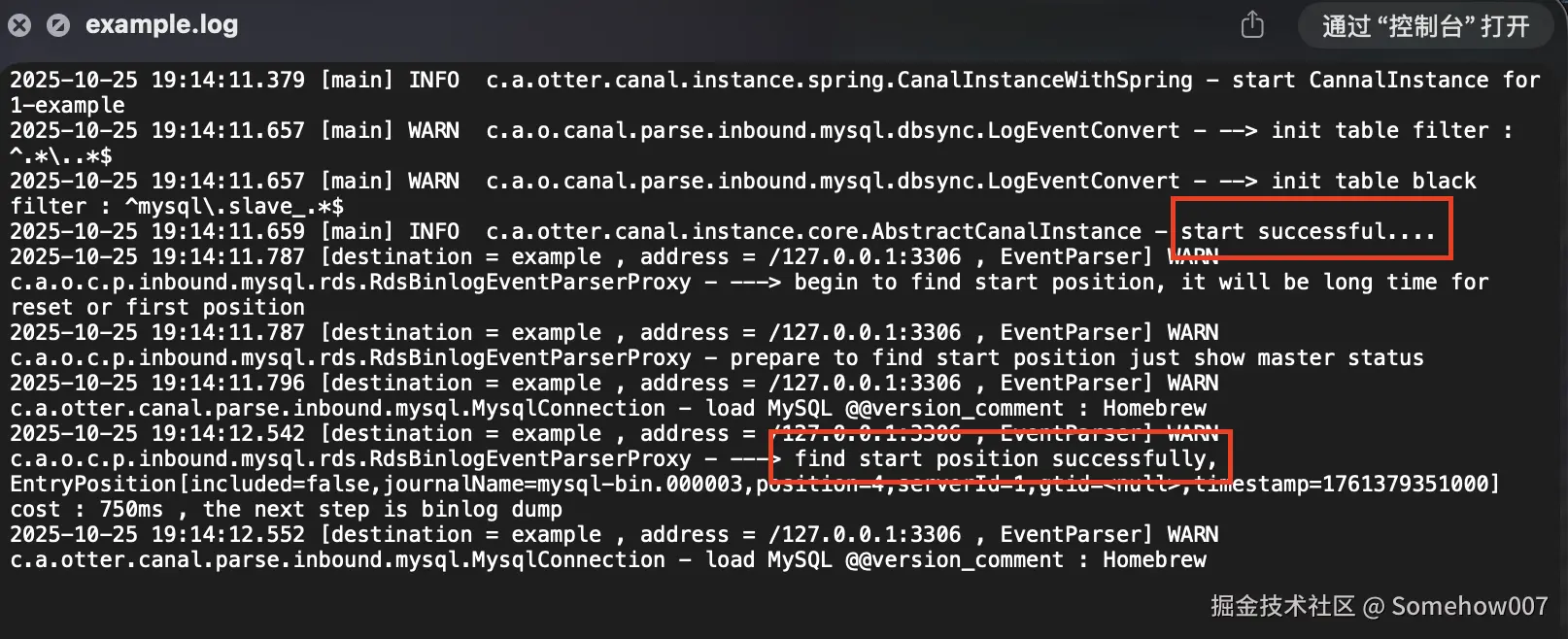 此时我们可以通过命令进行查看日志,或者直接查看 canal 目录中 logs/example/example.log 文件
