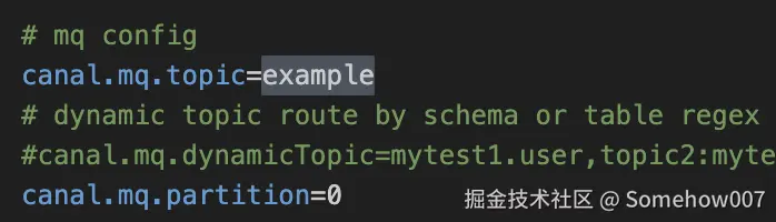 此处的 topic 作用为指定 canal 将数据变更信息发送到 RocketMQ 主题名称,用于区分不同实例或业务的数据流。