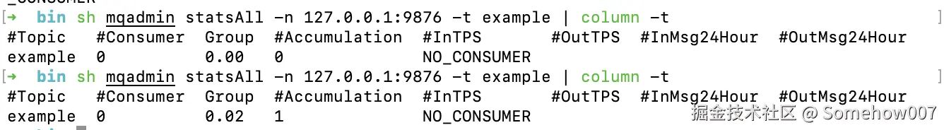 sh mqadmin statsAll -n 127.0.0.1:9876 -t example | column -t