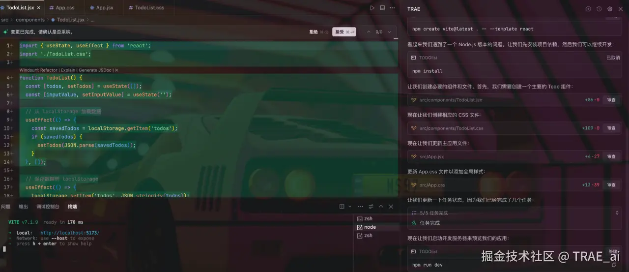 所有改动完成时,TRAE 给出明确提示。整个过程完全不需要自己编写代码,只需要参与需求提出、方案评审、效果验收,像是在指导一个执行力强的初级程序员。