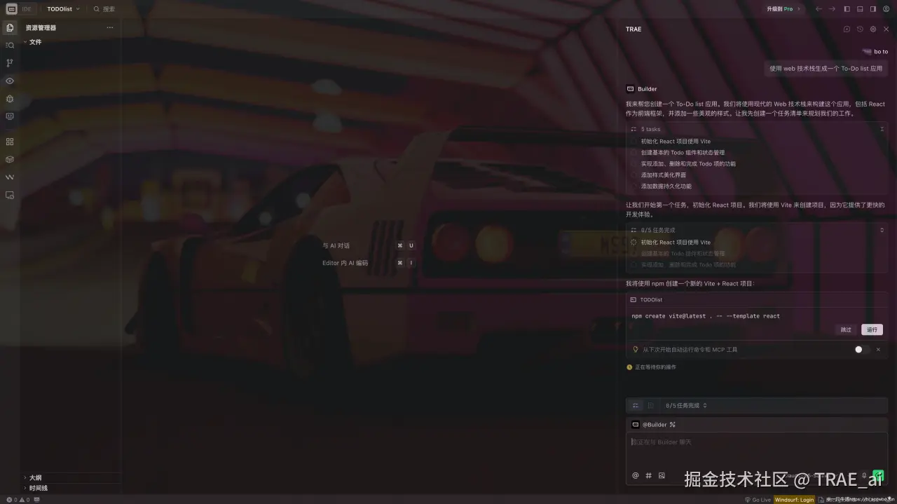 点击 TODO 应用示例后,TRAE AI 就开始工作了,它首先帮我梳理了产品的基本需求,比如: