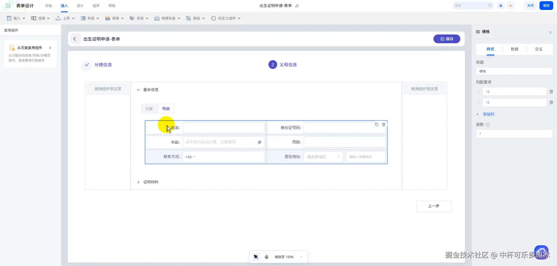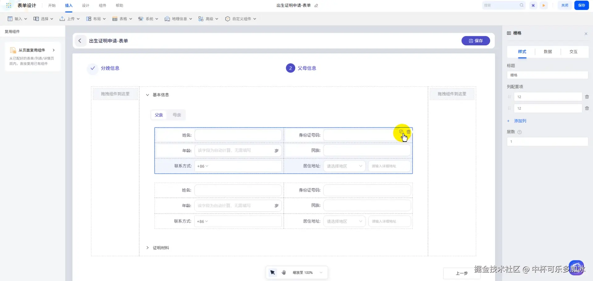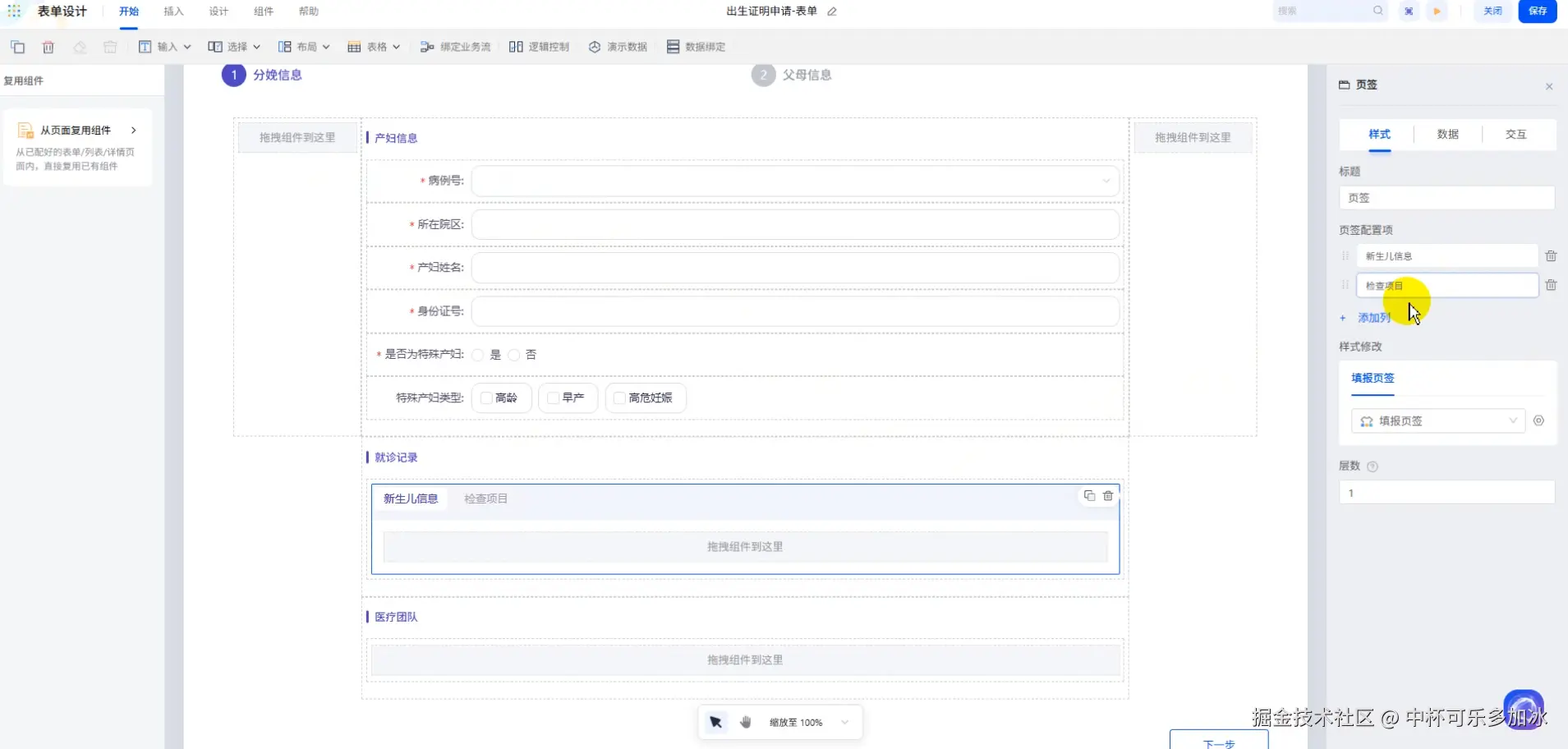 在“分娩信息”步骤中,进一步使用栅格布局与群组组件对字段进行归类和分组,确保界面整洁、逻辑清晰。