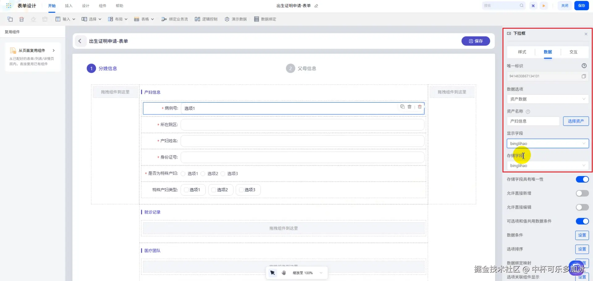 要实现此效果,只需选中下拉框组件,关联我们已预先准备好的产妇信息数据资产,选择病历号作为显示与存储字段。即完成了下拉框的选项设置。