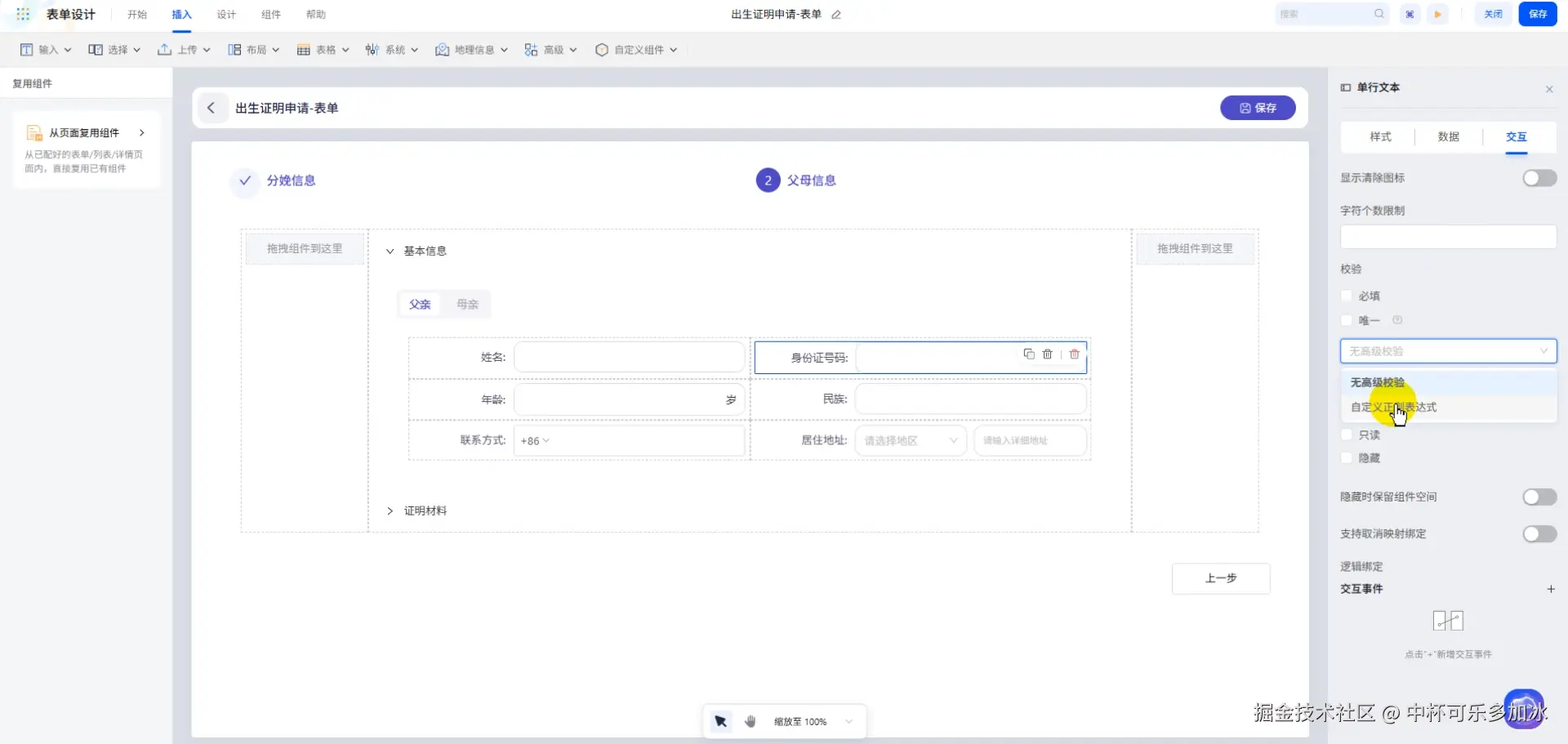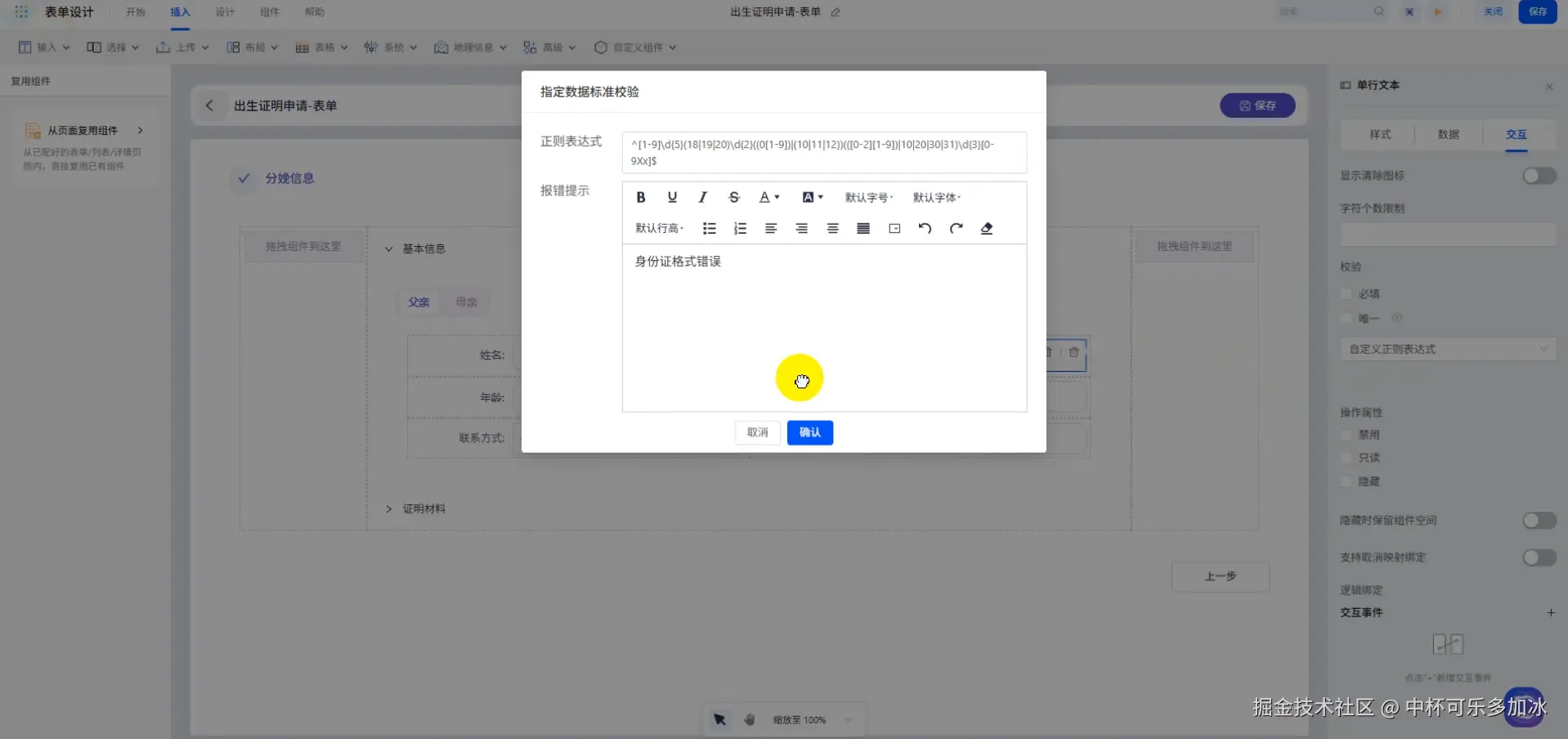 为了避免用户输入错误的身份证号格式,我们可以为组件添加正则表达式校验规则。