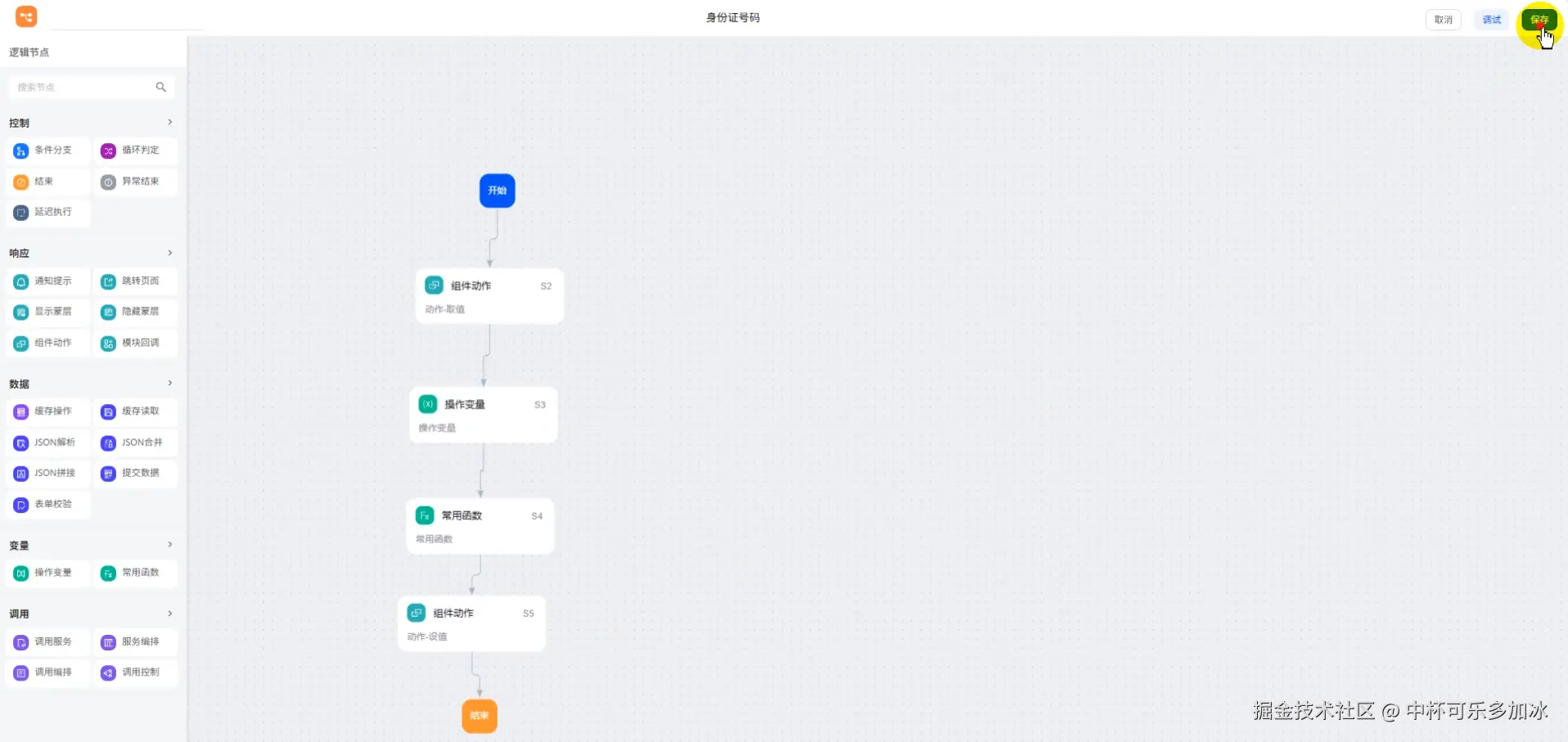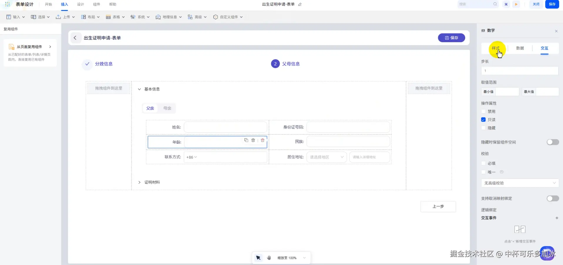 在实际场景下,用户输入身份证号后,应该自动计算出年龄。我们可以为身份证组件添加交互逻辑,当用户输入身份证号后,系统获取生日信息,并进行计算,最终将计算结果赋值年龄组件。