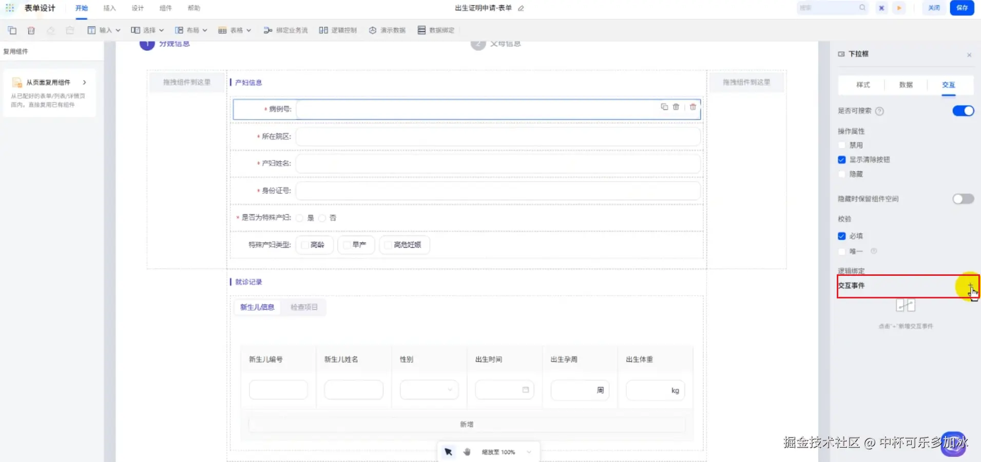 我们选中病例编号组件,配置交互事件,当选中选项后,系统将病例编号作为查询条件,在【新生儿信息】资产中查找相应数据,并填充至新生儿列表中。