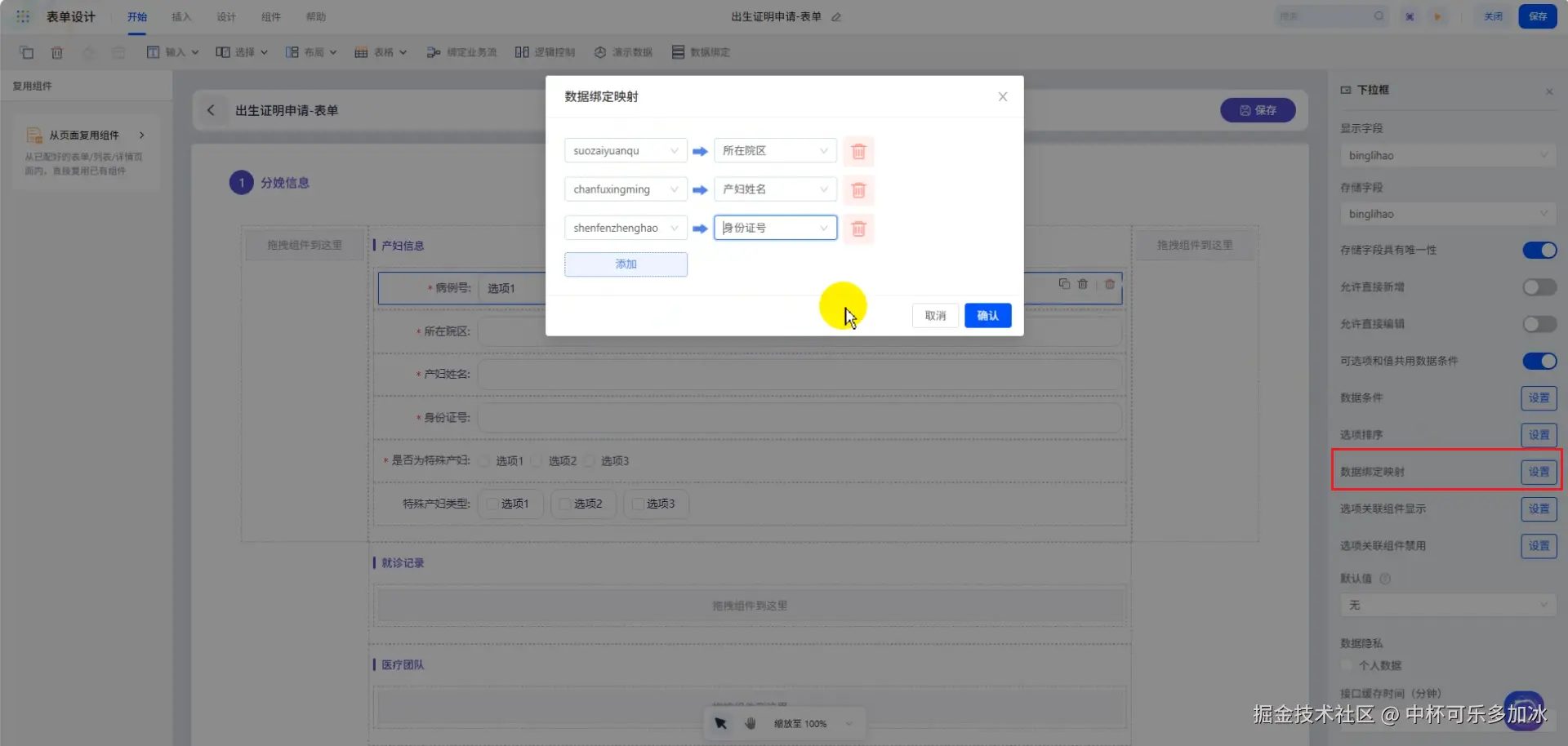 接下来,通过点击【数据绑定映射】,即可将选项关联的其他字段自动填充到表单的对应组件中。