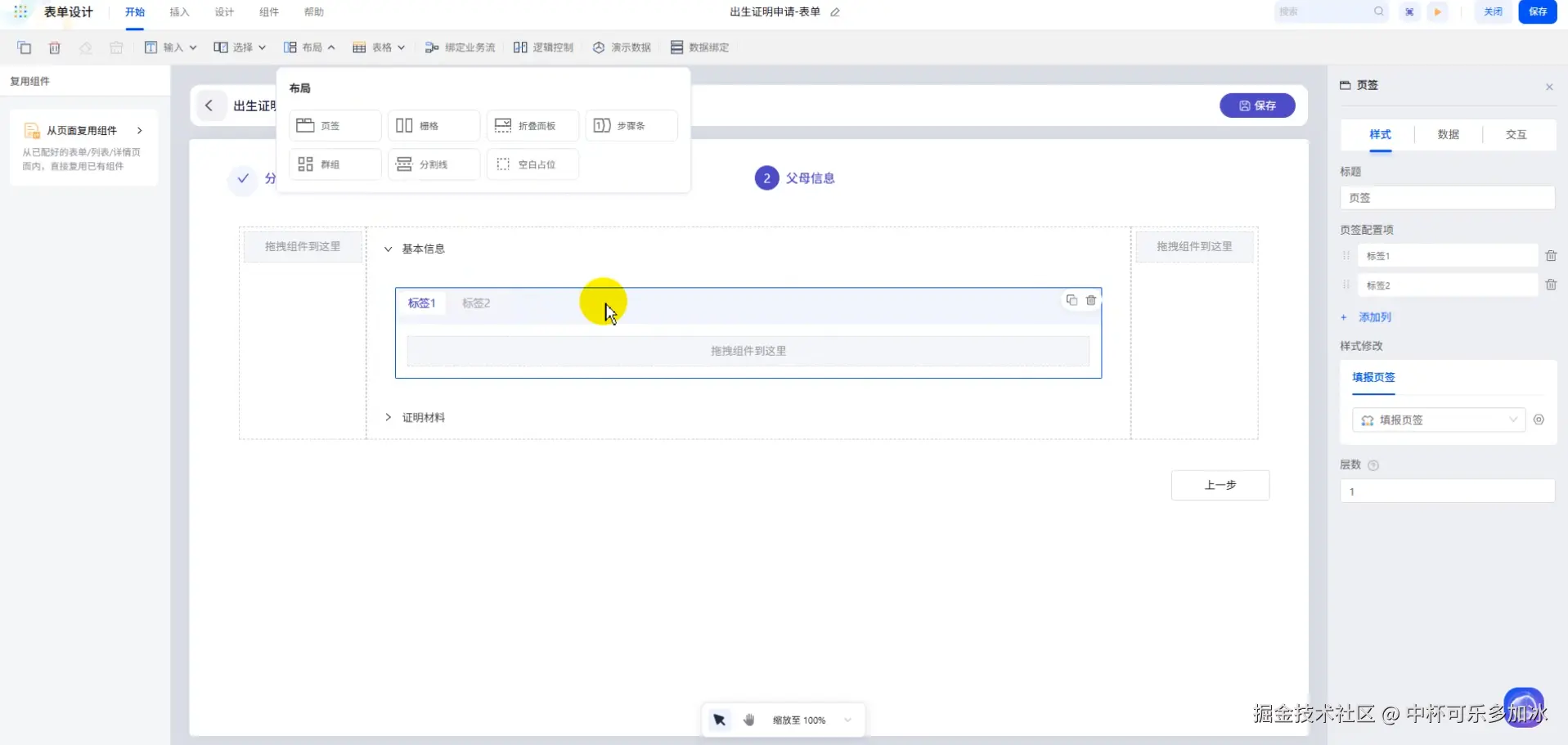 • 表单布局与交互设计:通过步骤条、栅格、页签、折叠面板等布局组件,实现复杂表单的清晰分类与流畅填写体验;