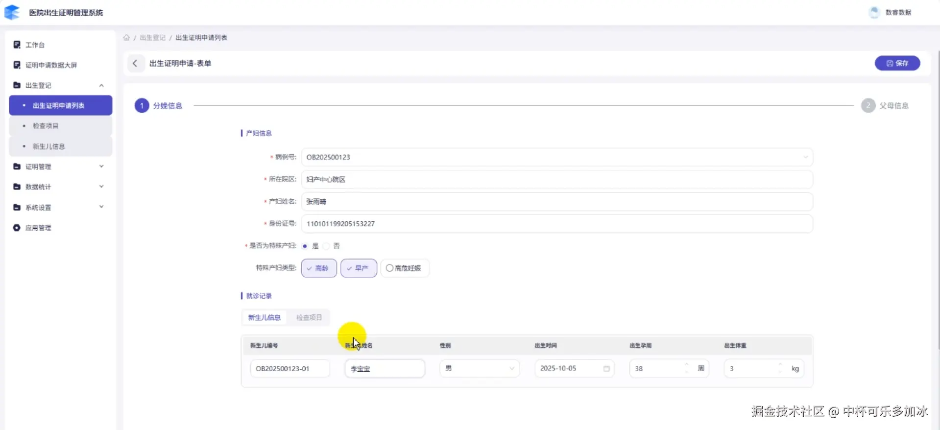 出生证明登记表单主要实现新生儿出生信息的在线填报、自动校验与电子化存储,涵盖以下核心内容: