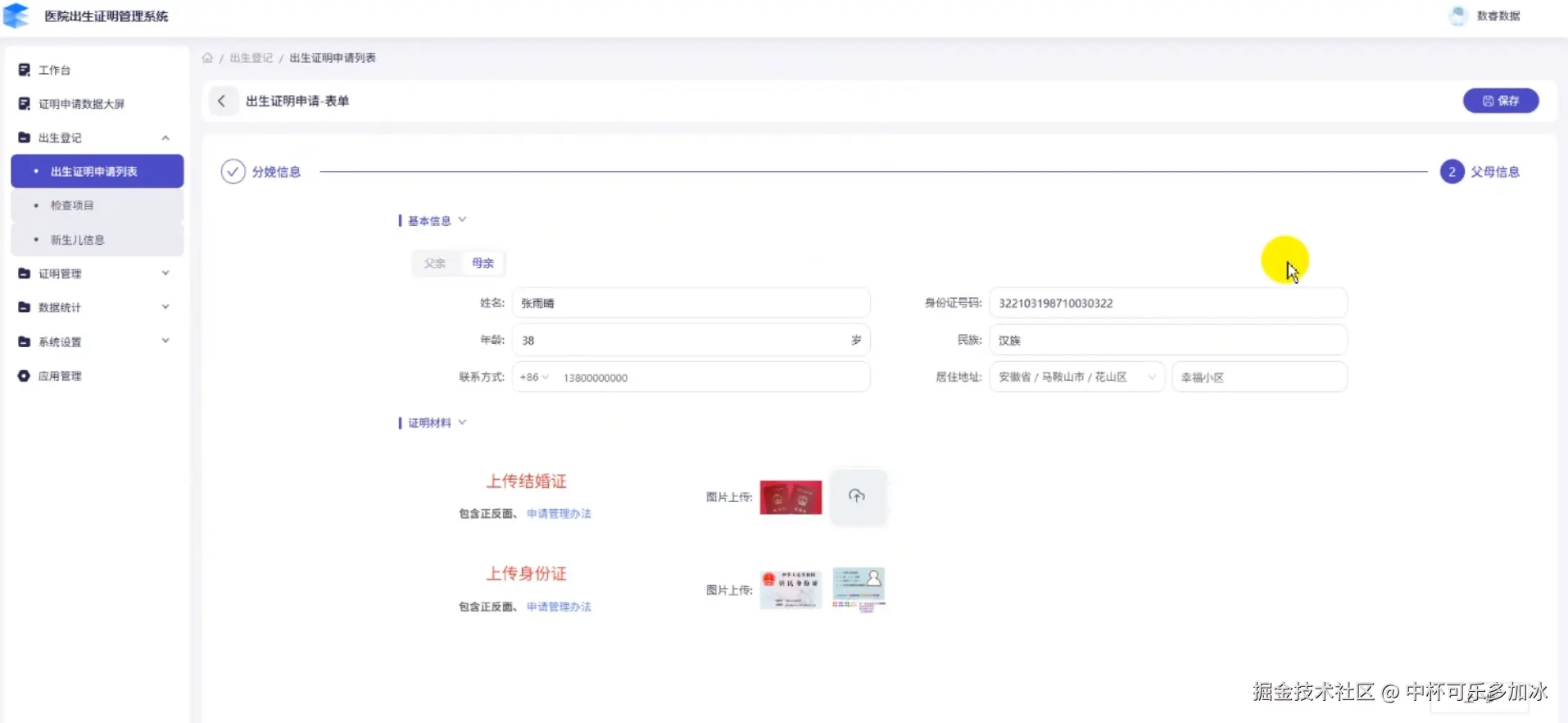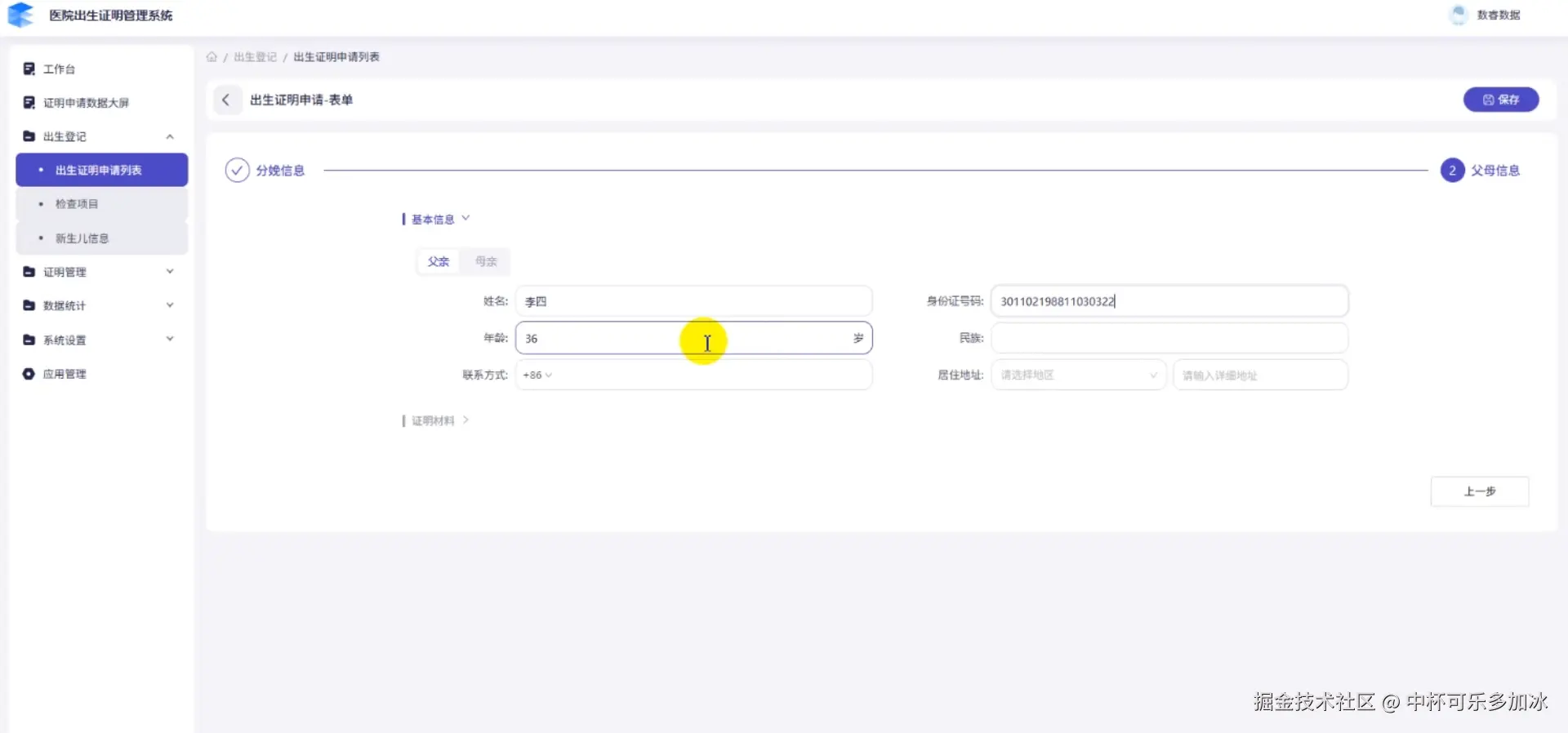 父母信息模块作为出生证明登记的第二步骤,负责收集父亲和母亲的基本信息及相关证明材料。该模块涉及个人信息量大、敏感度高,且部分字段需要严格的格式校验。我们采用折叠面板与页签布局相结合的方式,在保证信息完整性的同时,确保界面清晰、填写便捷。