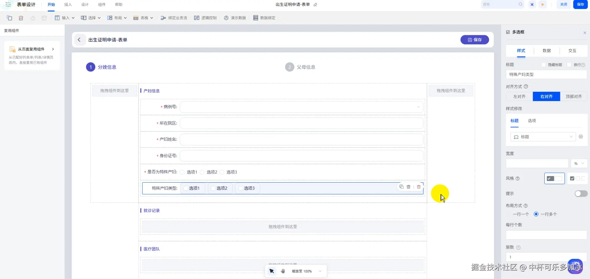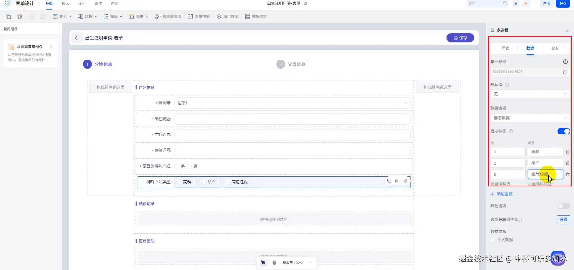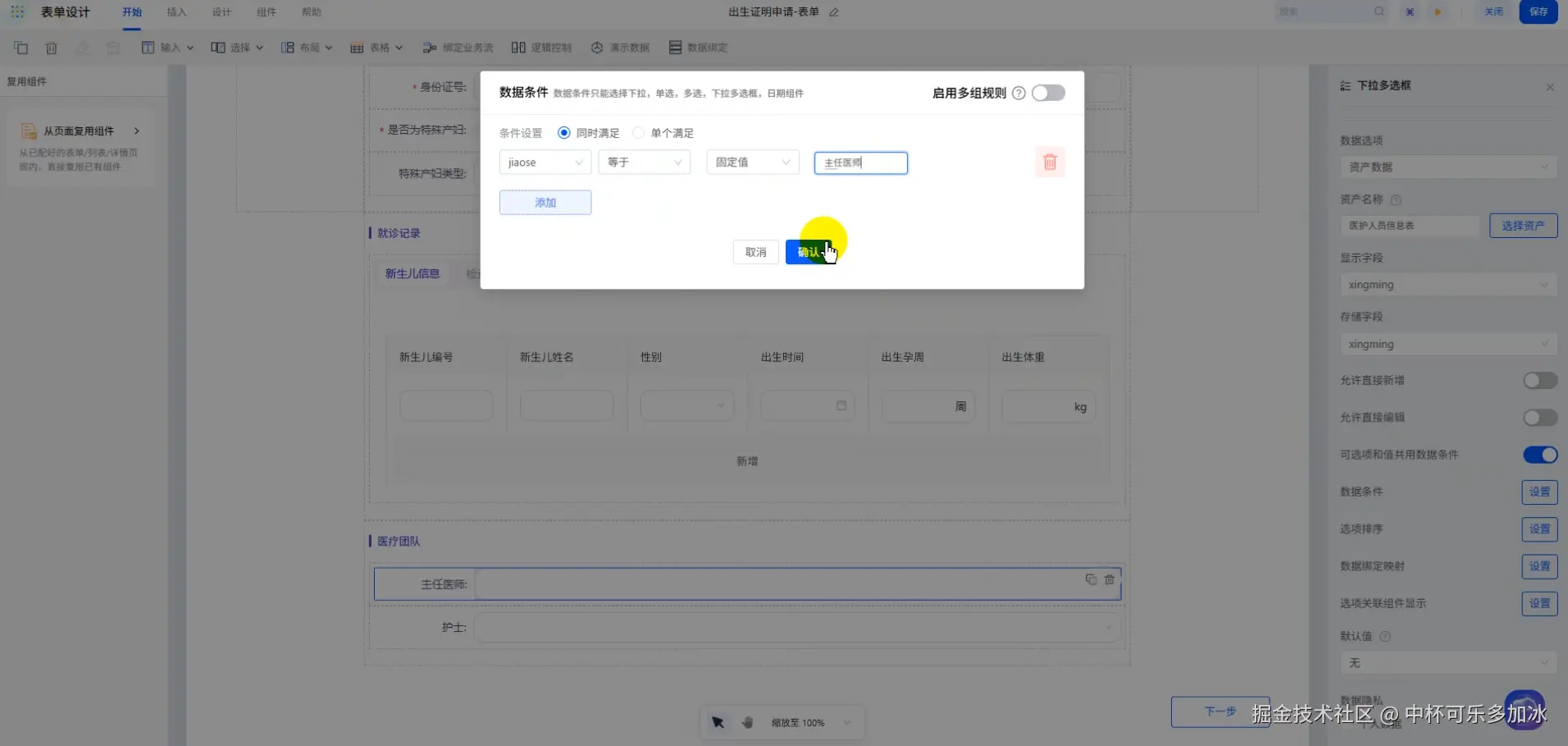 在医疗团队模块下,我们可以拖入下拉多选框组件实现一次选择多位医生信息,绑定医生信息资产作为下拉多选框选项。