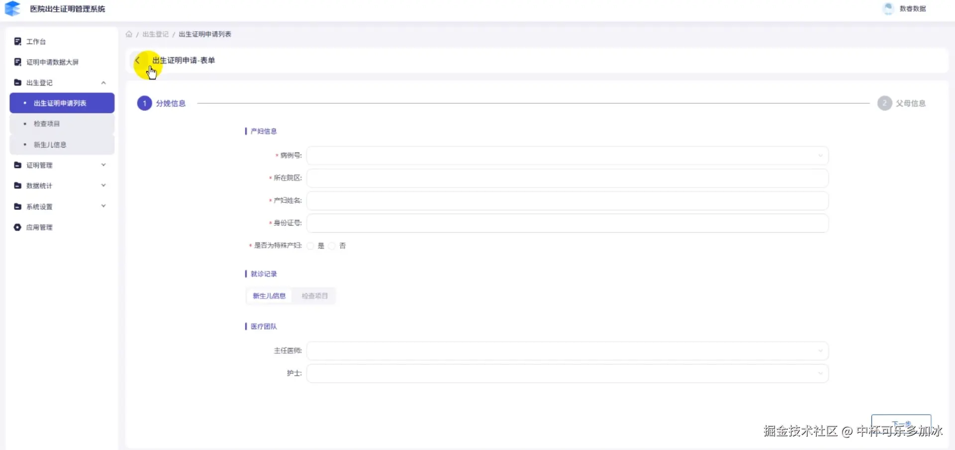 为提升填写体验,我们使用步骤条布局将表单分为“分娩信息”与“父母信息”两步,逐步引导用户完成填报。