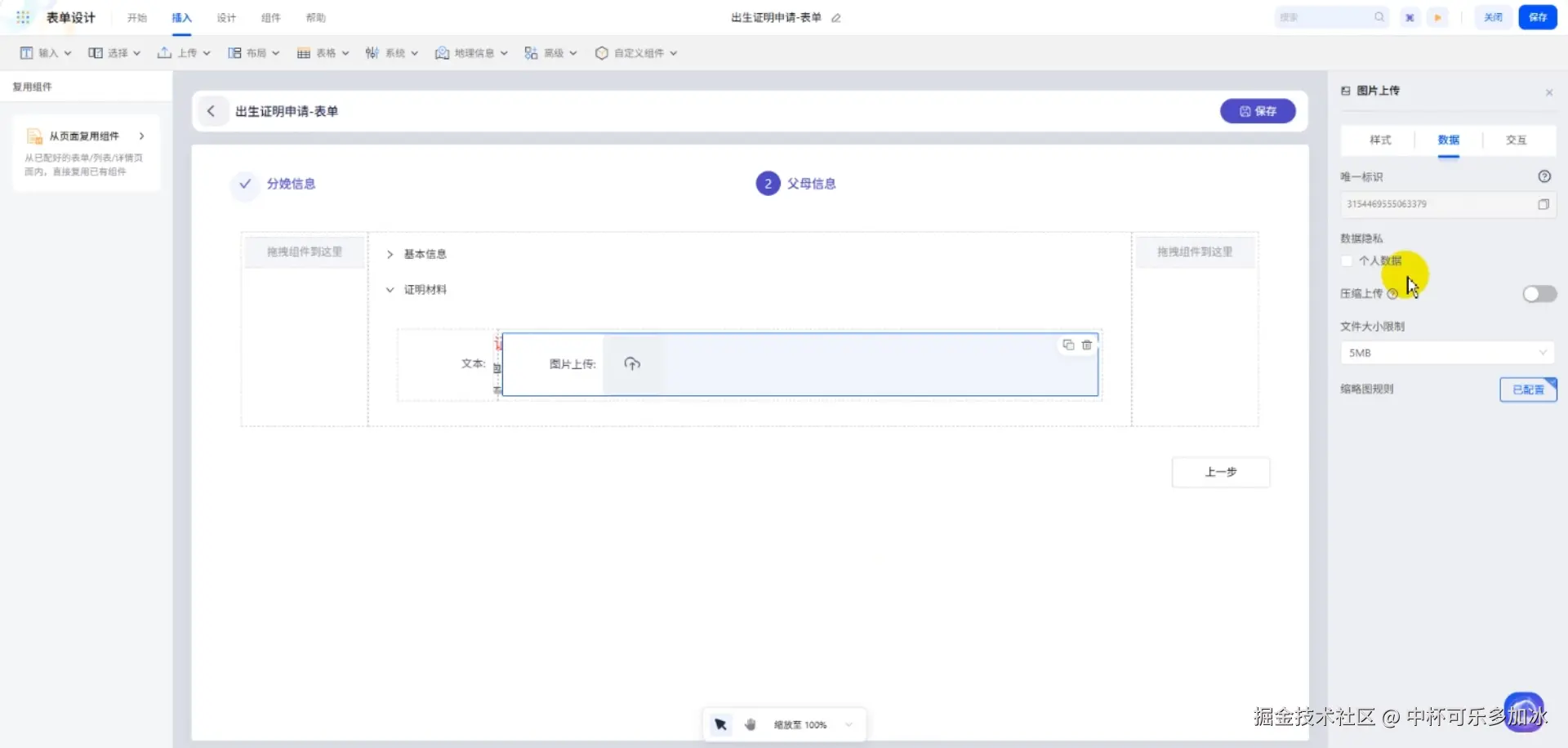 针对图片上传组件,我们可以设置上传的文件大小、文件格式、以及缩略图的展示规则,方便用户在提交前再次确认文件内容是否正确。