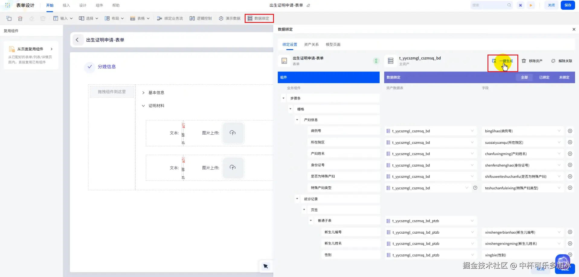 表单填写完成后,需要将数据存放至数据表中。我们点击数据绑定按钮,选择一键生成,系统便会自动生成与表单相符的数据模型,完成数据绑定工作。