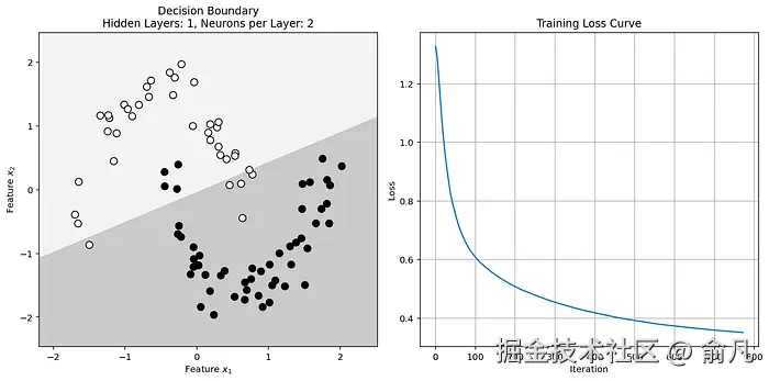 上方的图展示了一个具有一个隐藏层和一个神经元的小型神经网络,它试图对数据进行分类。然而,该网络仅学习到一个简单的直线边界,并不足以区分曲线形状。相比之下,下方的图展示了一个更大的网络,有两层隐藏层,每层有三个神经元。这个网络学习到了一个非线性边界,能够更好的适配数据。