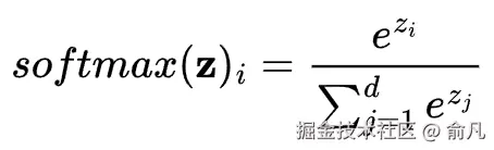 我们用 softmax 函数将这些原始分数转换为概率值。softmax 函数将实数向量转换为概率分布,每个输出值都在 0 到 1 之间,且所有输出值总和为 1。因此,softmax 函数通常被用作分类模型输出层的激活函数。