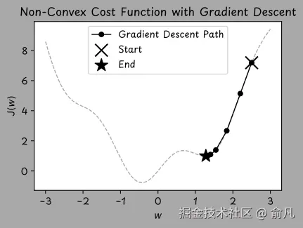 初始化完成后,用一种名为梯度下降的优化算法逐步调整权重和偏置值。梯度下降通过逐步小幅调整模型的权重和偏置值(朝着能减少误差的方向),来最小化成本函数,有点像沿着山谷的坡面向下走,以找到谷底的位置。