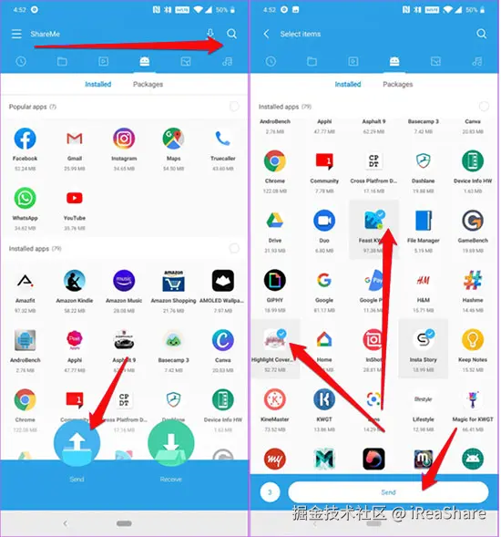 - 在手机上,点击ShareMe中的“发送”,选择文件,然后再次点击“发送”。