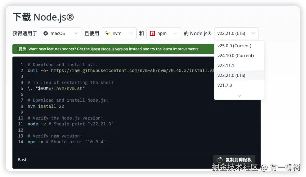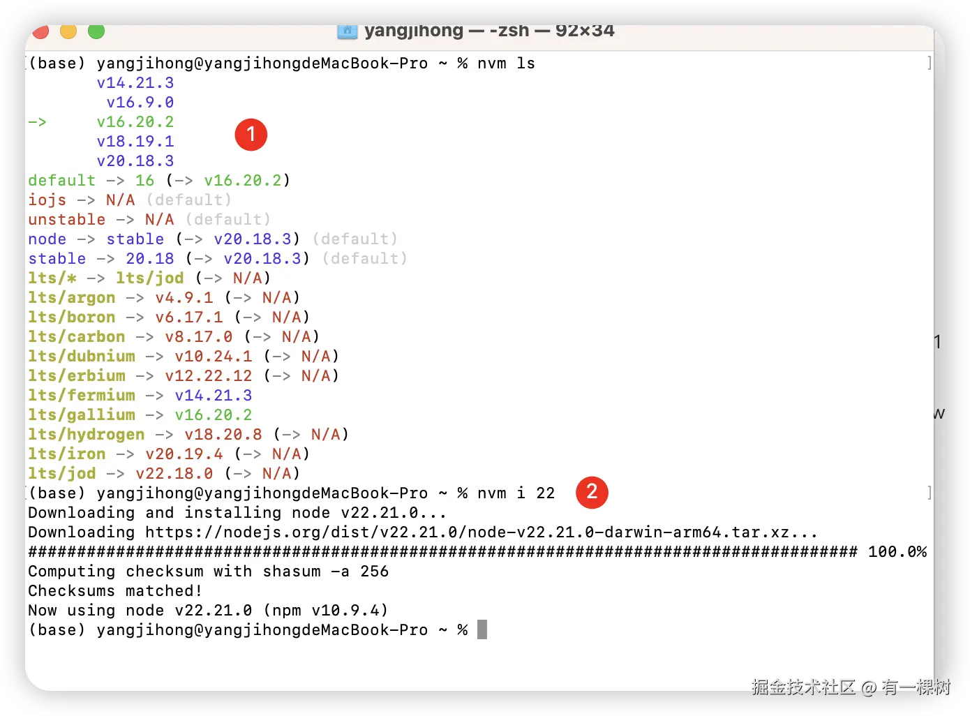如下图所示,你可以 nvm ls 查看当前已经安装的 Node 版本,然后安装你想要的版本如 22 Mac 电脑就使用 npm i 22 即可。