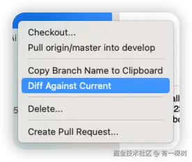 有一个 Diff Against Current(当前对比)功能,可以对比两个分支的代码差异,选中一个分支,然后右键,出现菜单如下图。
