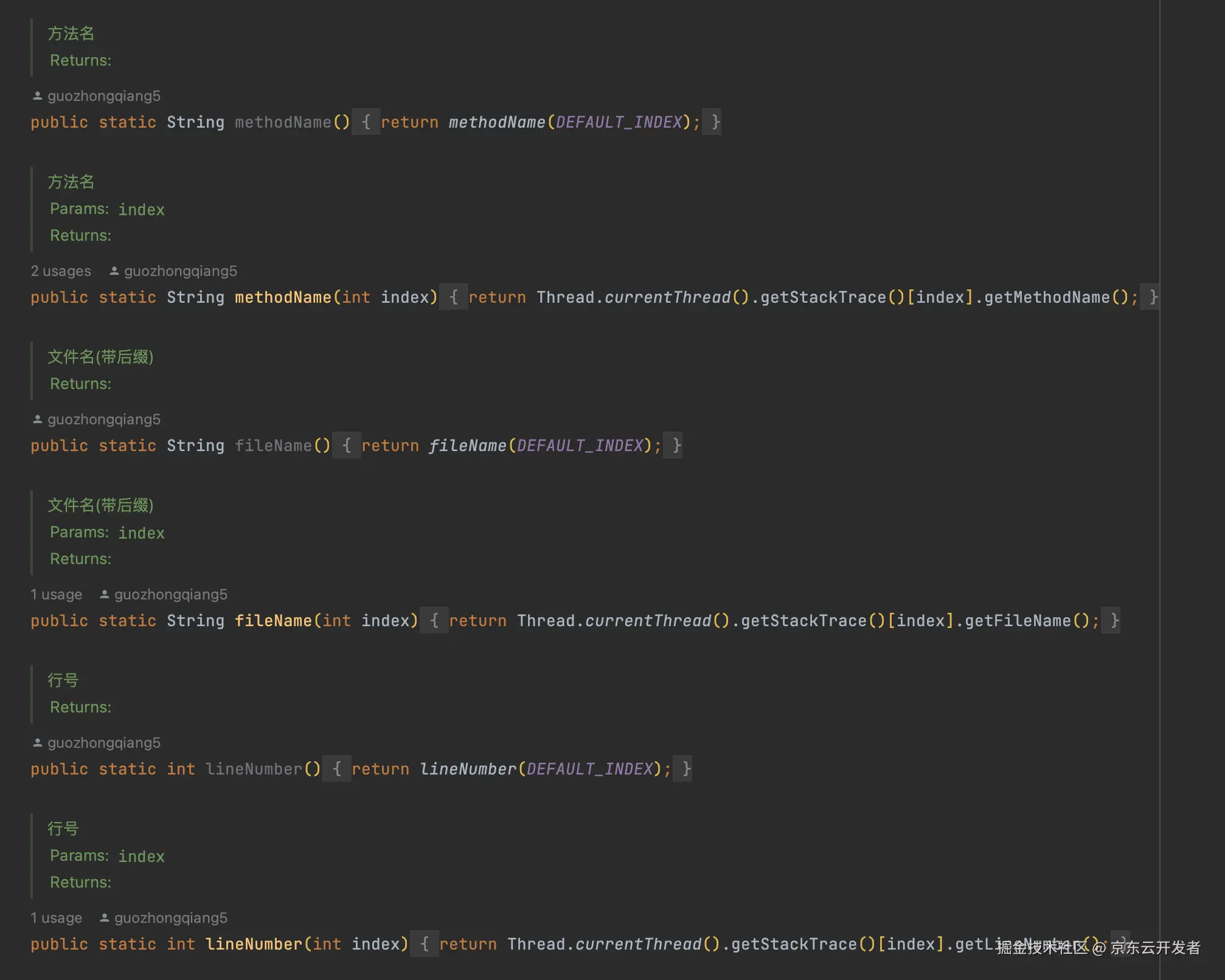 工具的核心代码并不复杂,StackTraceElement 也是 Java JDK 中现成的,我所做的工作主要是从中过滤出必要的信息,加工简化成,按照顺序整理成链式信息,方便我们一眼就可以看出来方法的调用链。