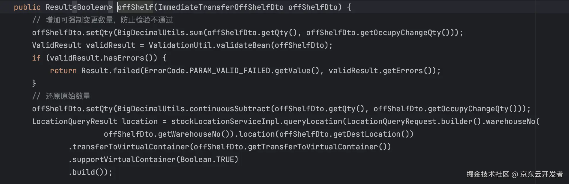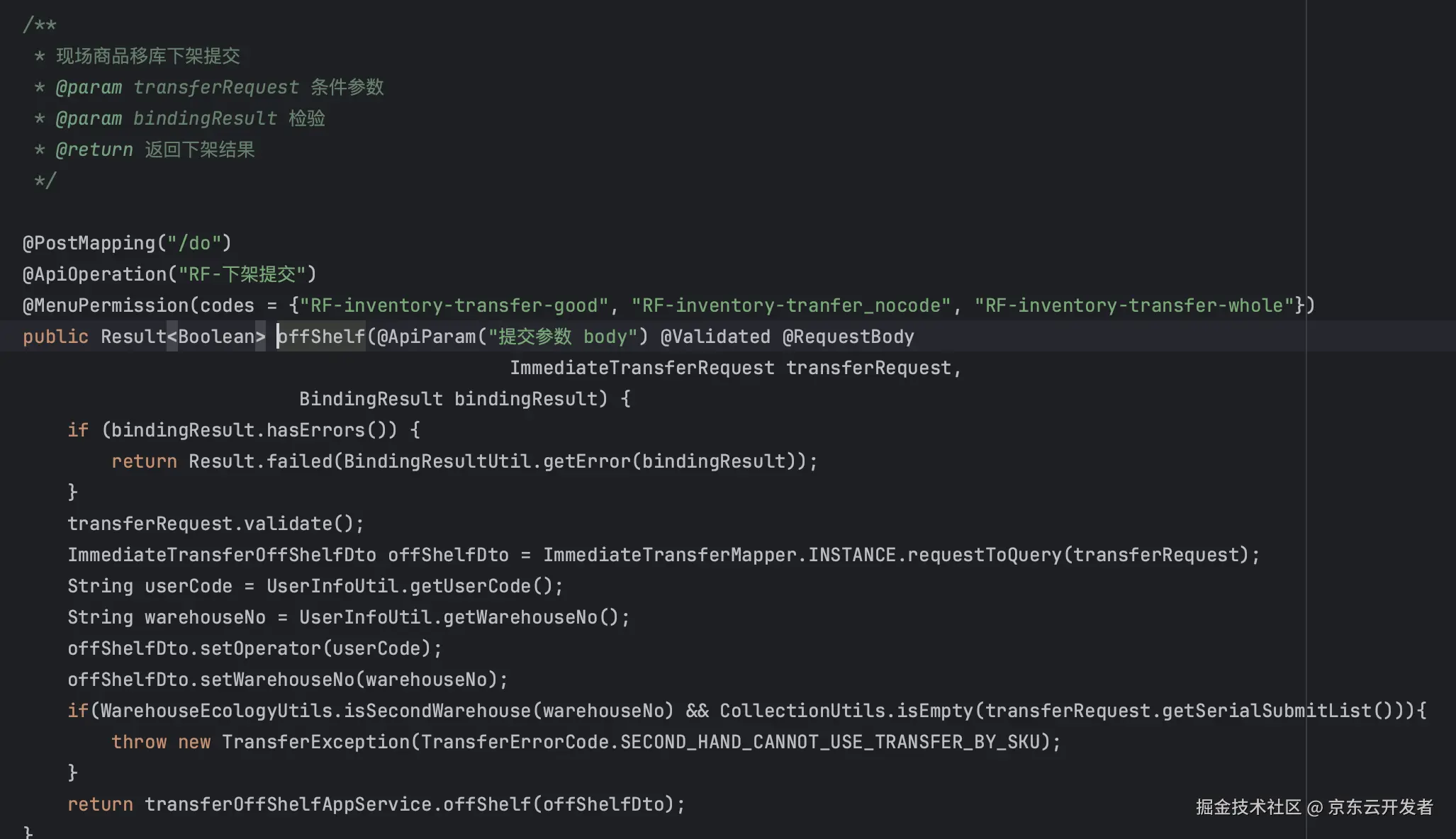 接入方法调用栈跟踪工具后,根据报错提示词,可以检索到对应日志,从 ImmediateTransferController#offShelf ==> AopConfig#pointApiExpression ==> TransferOffShelfAppServiceImpl#offShelf ==> TransferOffShelfAppServiceImpl#doOffShelf 中顺藤摸瓜可以快速找到流量入口的代码位置。