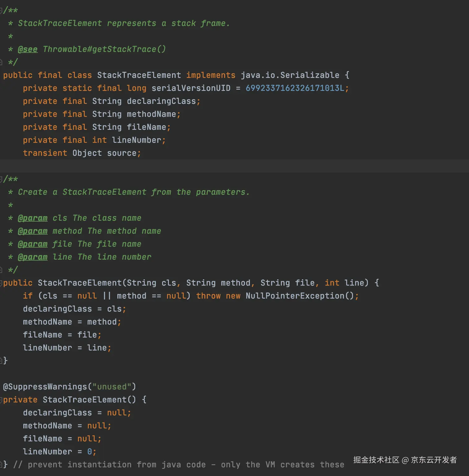 从Java中的Throwable中,可以看到staceTrace的get和set,这个StackTraceElement数组里面存放的信息就是我们在异常堆栈中经常看到的信息。