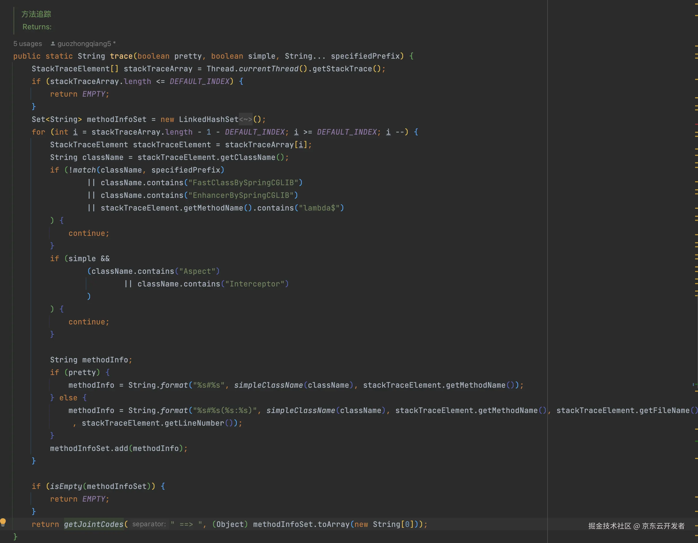 工具的核心代码并不复杂,StackTraceElement 也是 Java JDK 中现成的,我所做的工作主要是从中过滤出必要的信息,加工简化成,按照顺序整理成链式信息,方便我们一眼就可以看出来方法的调用链。