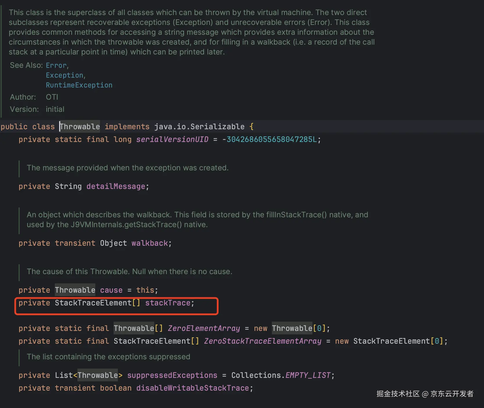 从Java中的Throwable中,可以看到staceTrace的get和set,这个StackTraceElement数组里面存放的信息就是我们在异常堆栈中经常看到的信息。