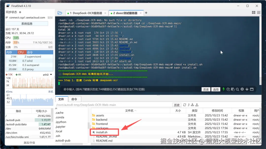 而等待运行完成后,即可以进一步使用前端来调用DeepSeek-OCR模型了。开启前端的方法也非常简单,我们只需运行如图所示的命令,也就是运行第二个脚本start.sh即可。