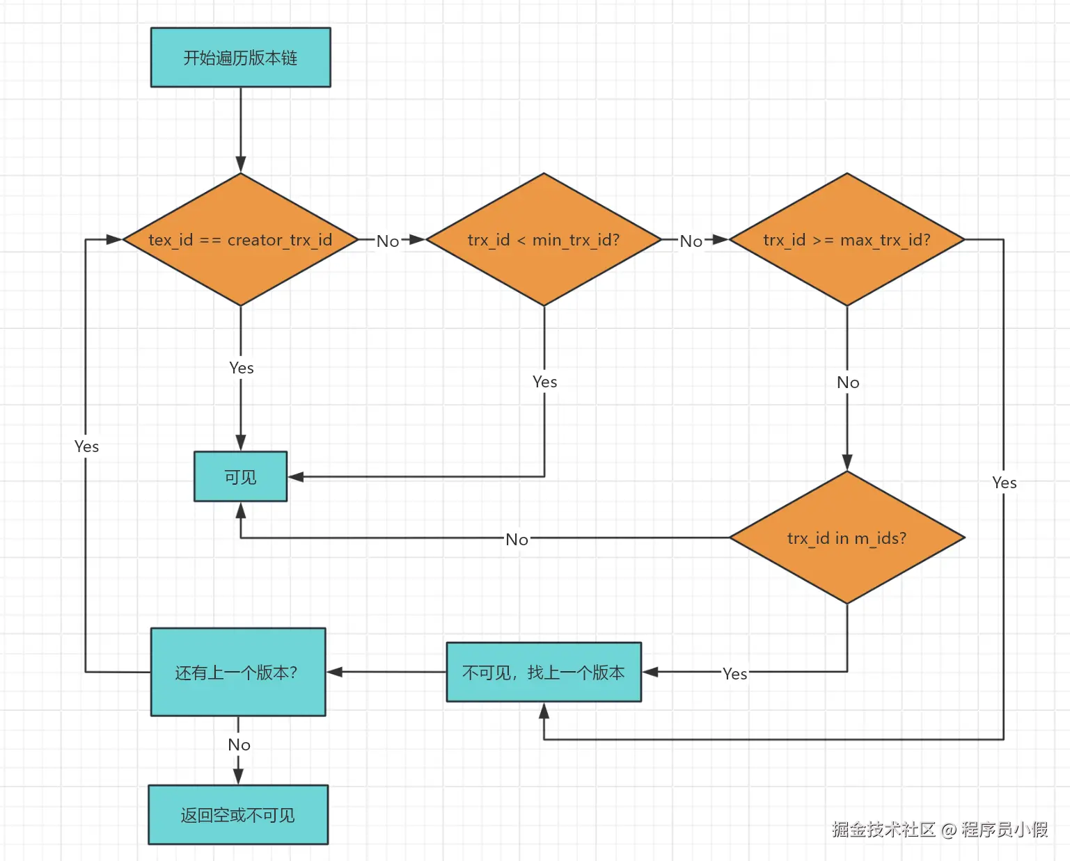trx_id >= max_trx_id:- 说明这个版本是在当前 Read View 创建之后才开启的事务修改的,这个版本不可见。