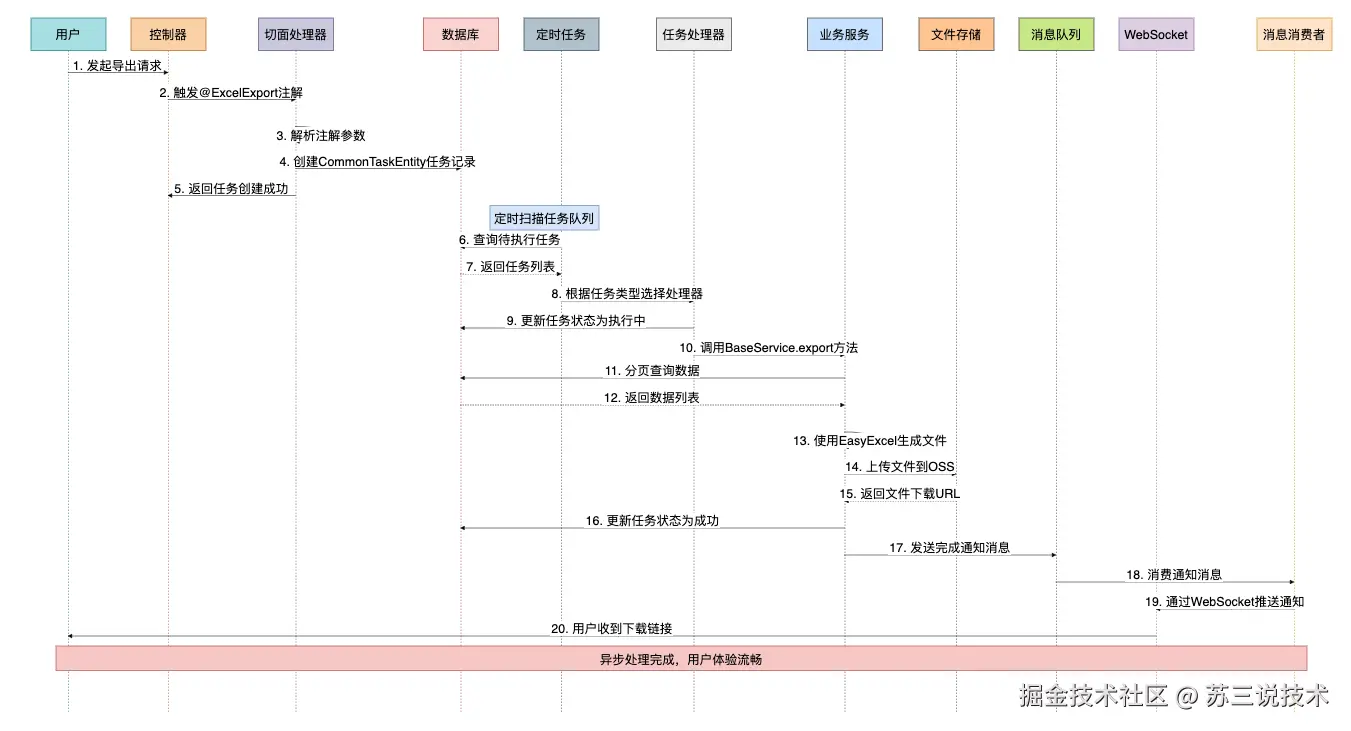 苏三商城项目创新性地设计并实现了一套完整的Excel异步导出机制,通过注解驱动、任务队列、定时调度、消息通知等技术手段,完美解决了大数据量导出的技术难题,成为项目的重要技术亮点。