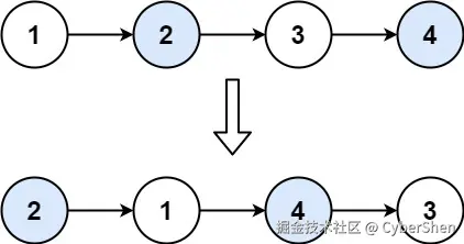 给你一个链表,两两交换其中相邻的节点,并返回交换后链表的头节点。你必须在不修改节点内部的值的情况下完成本题(即,只能进行节点交换)。